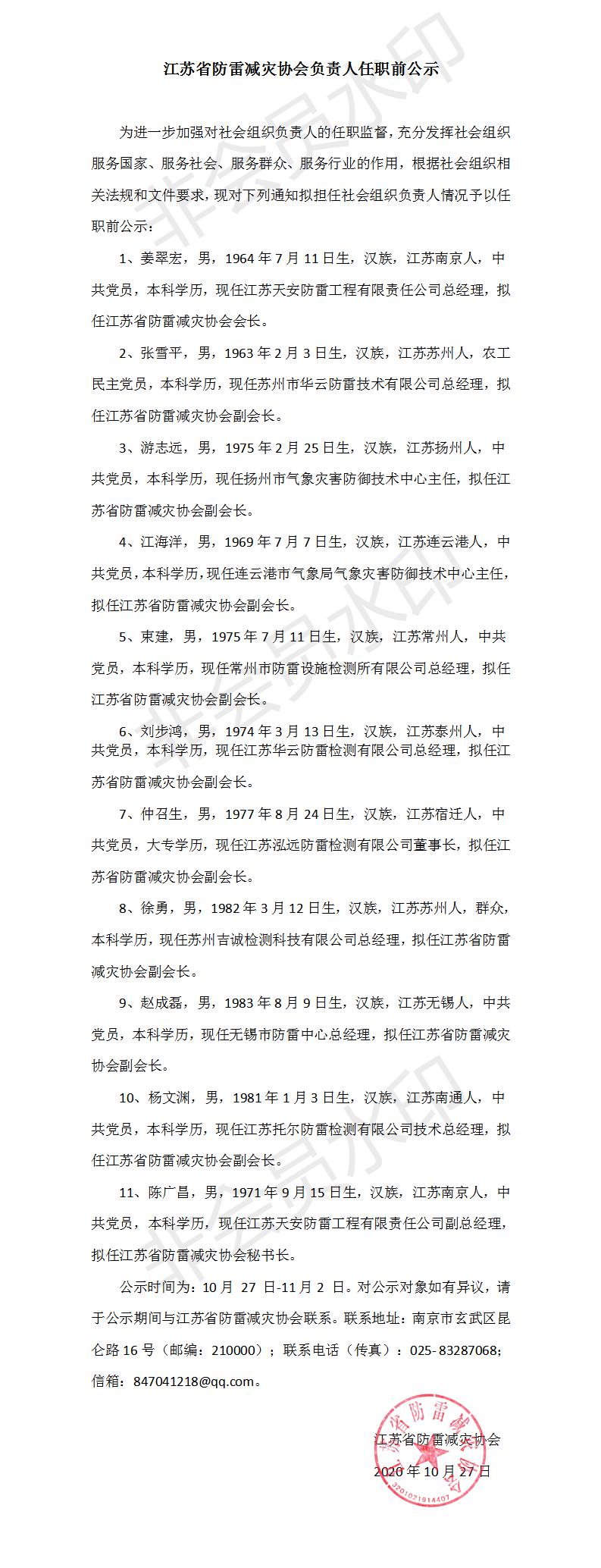 江苏省防雷减灾协会负责人任职前公示