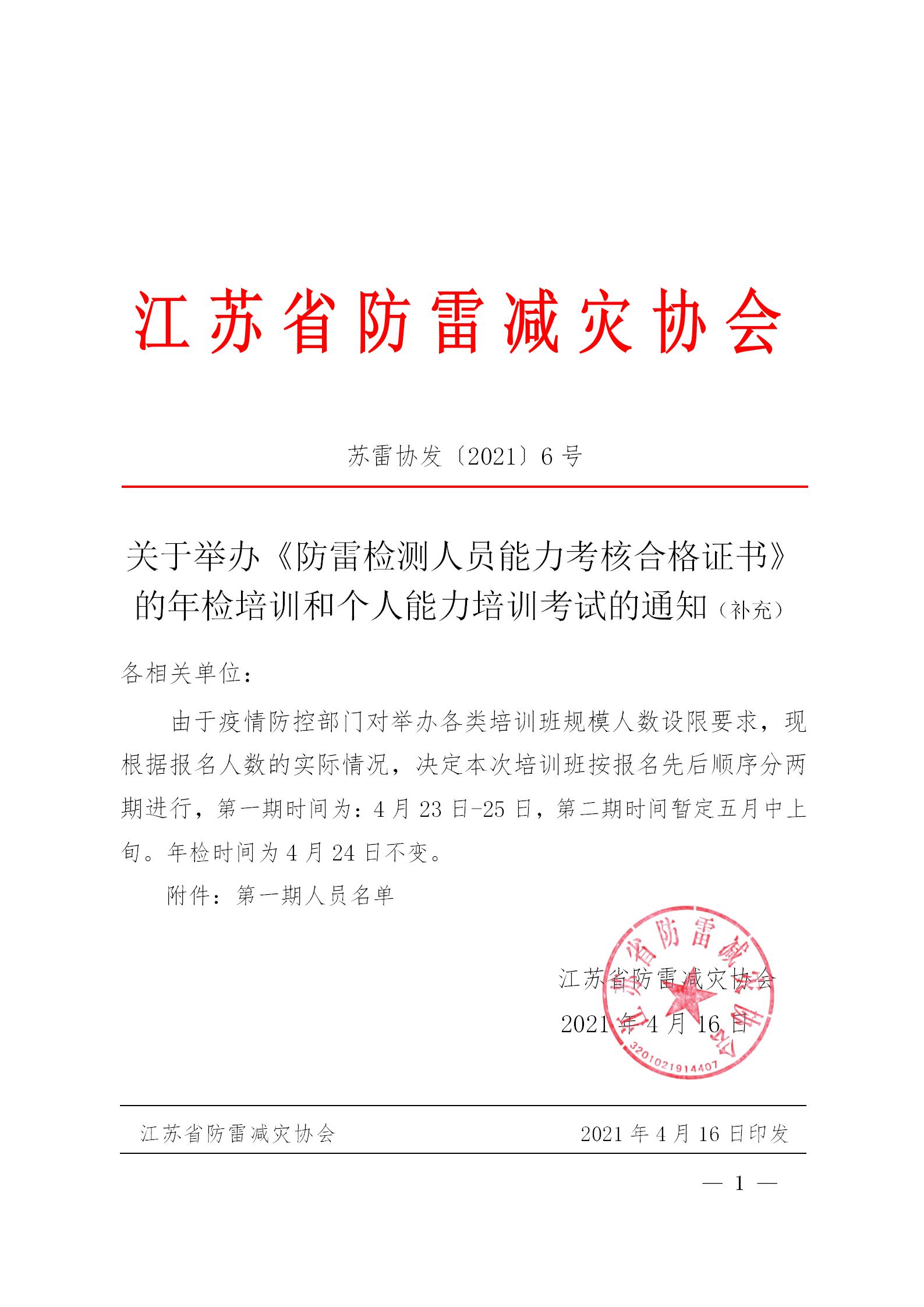 关于举办《防雷检测人员能力考核合格证书》的年检培训和个人能力培训考试的通知(补充)